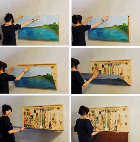 -We all know how easily earrings, necklaces and all other jewelry get tangled up. An easy way to avoid that is by hanging them on a corkboard. However, you might not want to keep grandma’s heirloom pearl earrings or the necklace mom got you for graduation in sight of any who pass through your home, especially if you entertain often. An easy hack for this is to simply attach a picture the size of your corkboard with a few hinges to makeyour own personal safe. Of course, this or any other hidden storage area idea shouldn’t be your only line of defense against would-be burglars. If the worst does happen, and you are burglarized, having renter’s insurance will help cover the cost of your valuables.